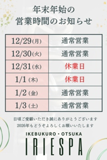 エステの森 東京 TOP > 東京都 > 池袋・代々木 > マンション型 > IRIE SPA(アイリースパ) > 年末のお知らせ