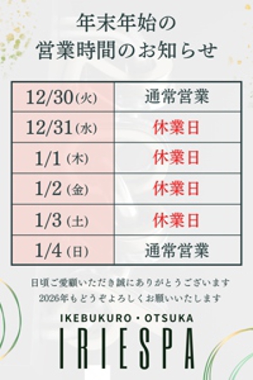 エステの森 東京 TOP > 東京都 > 池袋・代々木 > マンション型 > IRIE SPA(アイリースパ) > 年末年始のお知らせ